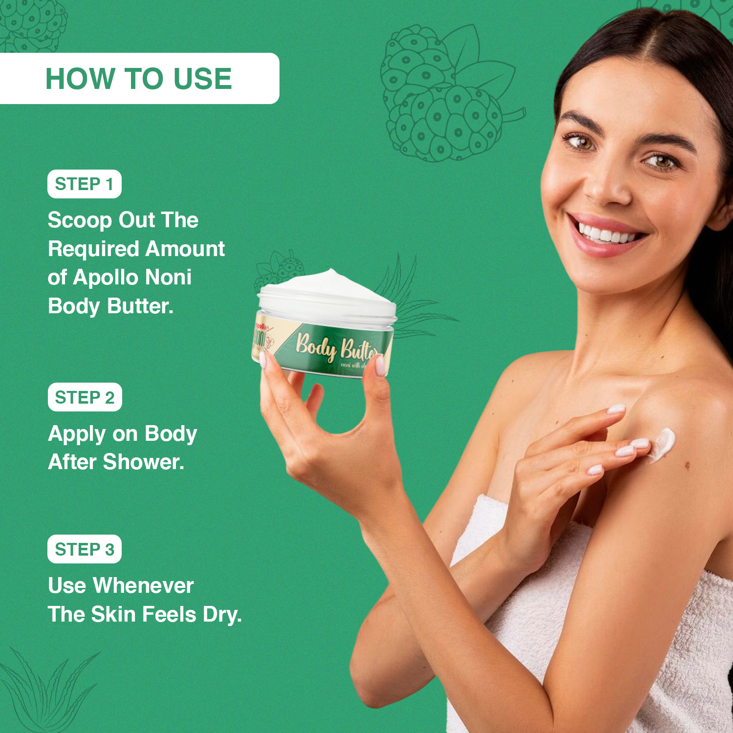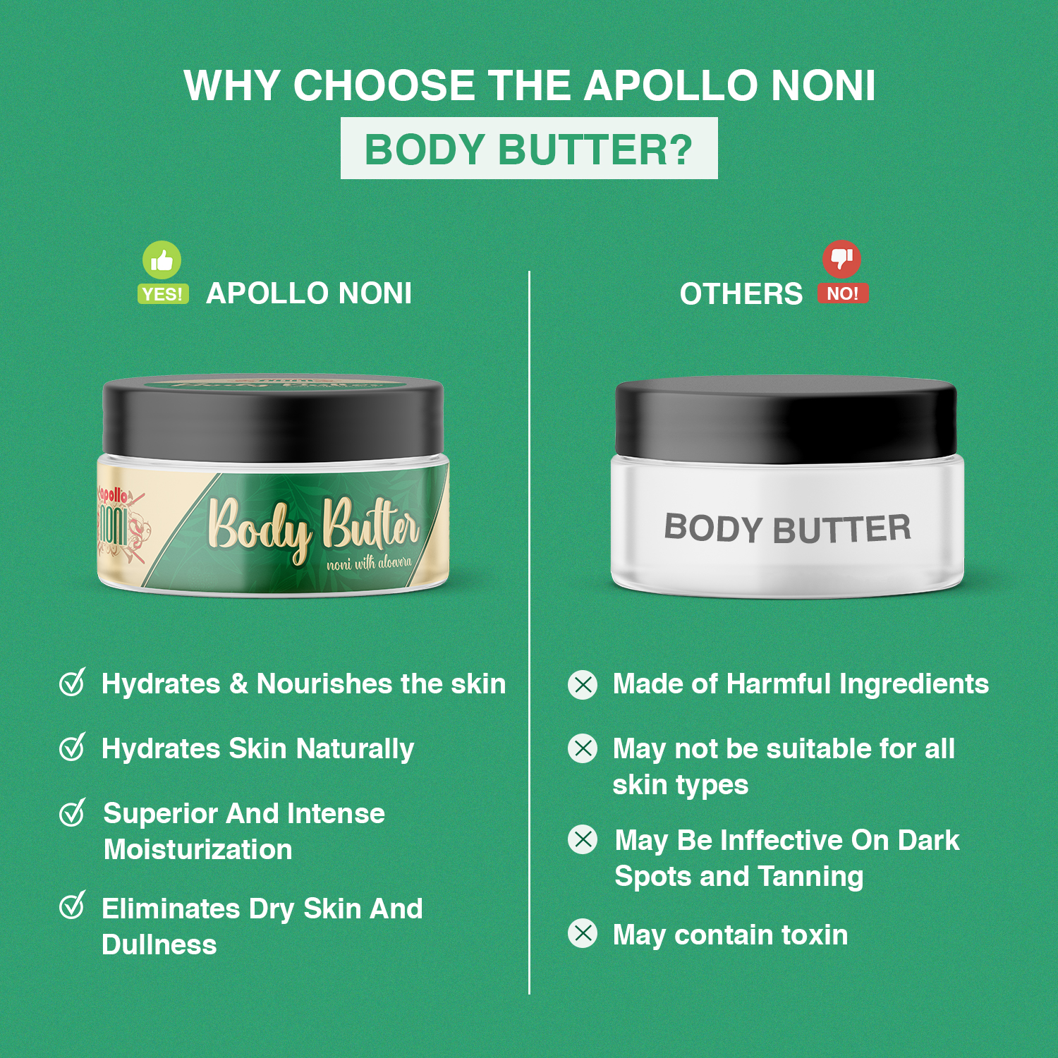 Experience luxury hydration with perfection. Apollo Noni Noni Body Butter Cream is dermatologically tested, made in India, scientifically formulated, GMP-certified, and trusted by thousands as a Best Selling Body Butter for quality and results.