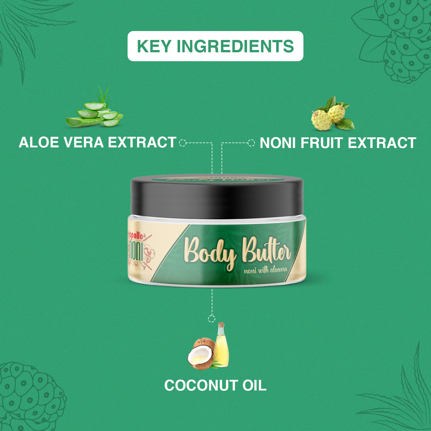 Noni Body Butter Cream by Apollo Noni is a deeply nourishing, ultra-hydrating moisturizer crafted for those who want smooth, glowing, softer-looking skin every single day. Rich in Noni Extract, Aloe Vera Butter, and natural plant emollients, this Herbal Noni Body Butter melts into the skin effortlessly — leaving it supple, radiant, and beautifully moisturized for hours. The texture feels creamy yet light, making it the Best Body Butter Cream for daily use on dry, dull, sensitive, and mature skin.
